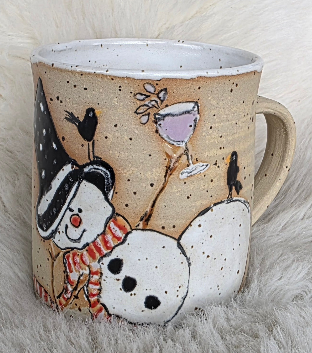 Wenn der Schneemann auftaut, wird’s gemütlich! Die handgefertigte Tasse „Aufgetaut“ bringt mit ihrem fröhlich-verschmitzten Schneemann-Motiv gute Laune in kalte Wintertage. Im Glas leuchtet schon der Rotwein – vielleicht wird ja bald Glühwein daraus?